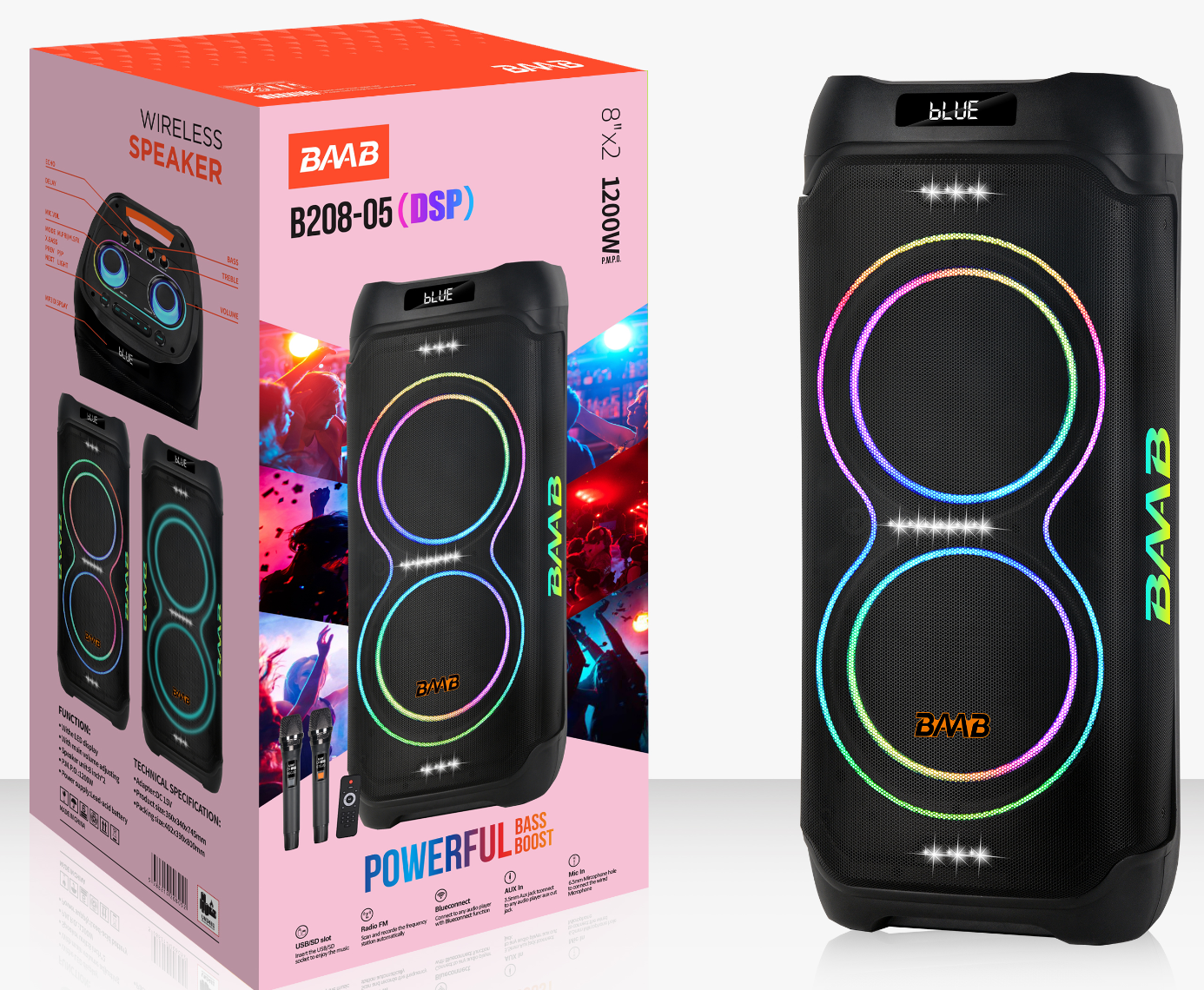 | *Material:Plastic *RMS Power: 80 W (DSP) *2 knob+LED display *Speaker unit:2X8 inch *Battery:12V9A *Function:USB/TF/Bluetooth/FM/TWS/ *Accessory:AC cable,manual,remote control,UHF wireless microphone |