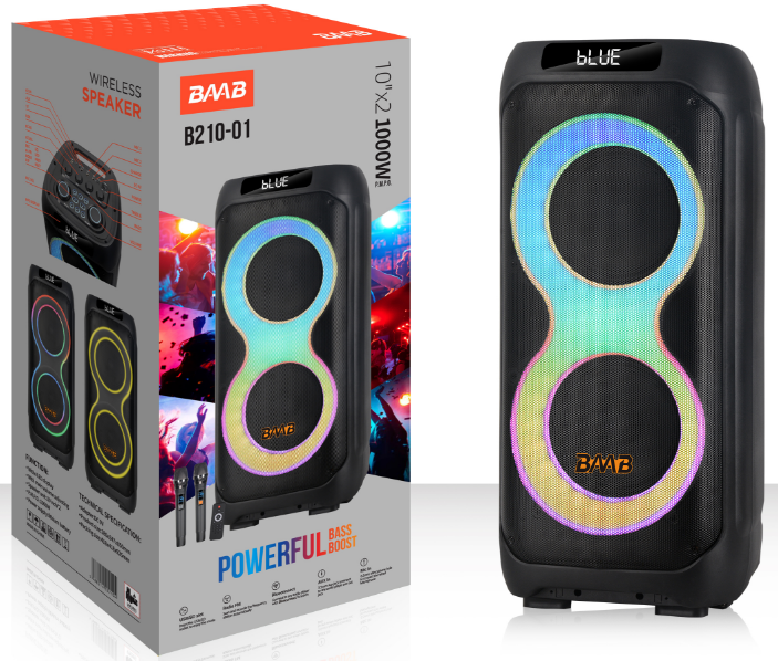 | *Material:Plastic *Speaker unit:2x10inch *RMS Power: 2Knobs+RMS 50W *Battery:7.4V/6000MAH lithium battery *Function:USB/TF/Bluetooth/FM/TWS/ *Accessory:9V2A adapter,manual,remote control,wireless microphone*2 |