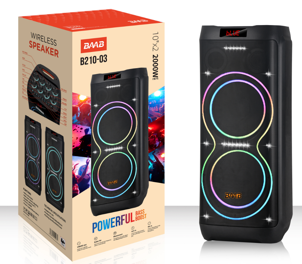 | *Material:Plastic *Speaker unit:2x10inch *RMS Power: 8Knobs+RMS 80W *Battery:12V/7AH lead Acid battery *Function:USB/TF/Bluetooth/FM/TWS/ *Accessory:15V4A adapter,manual,remote control,wireless microphone*2 |