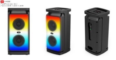| Speaker:Dual 4″ Power output: 5W*2 Battery: 3.7V3600mA BT/USB/TF/FM/AUX/MIC/TWS With one wired Mic Size:190*190*410MM 4000pcs/40″HQ |