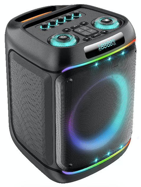 | Speaker:8″+1″ | RMS:40W Battery:7.4V4.5A | 317x340x430mm | Bluetooth/USB/TF/FM/MIC/AUX/TWS/RGB Lights Effect/Bass, Treble, Echo, Mic Priority Adjustments. Accessories: Remote controller, Wireless Microphone 1 PCS, Battery for remote controller, Battery for Microphone, FM antenna, Bluetooth antenna,User manual, Colored Box |