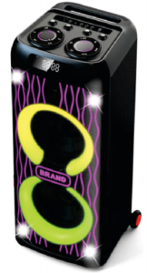 | Speaker: Dual10″+1″ | RMS:100W Battery:12V4.5A | 365x365x880mm | Bluetooth/USB/TF/FM/MIC/AUX/TWS/RGB Lights Effect/Bass, Treble, Echo, Mic Priority Adjustments. Accessories: Remote controller, Wireless Microphone 1 PCS, Battery for remote controller, Battery for Microphone, FM antenna, Bluetooth antenna,User manual, Colored Box |