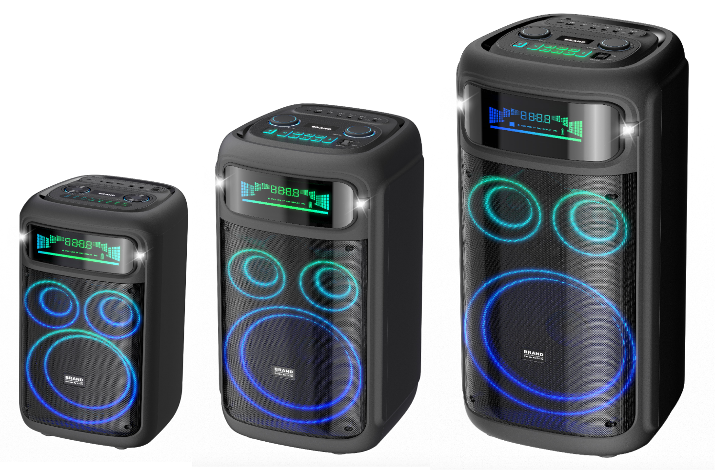 | BTS-C853 | Speaker:8″+3″*2+1″ | RMS: 60W Battery: 7.4V/4500mAh | 280x282x576mm | Bluetooth/USB/TF/FM/MIC/AUX/TWS/RGB Lights Effect/Bass, Treble, Echo, Mic Priority Adjustments. Accessories: Remote controller, Wireless Microphone 1 PCS, Battery for remote controller, Battery for Microphone, FM antenna, Bluetooth antenna,User manual, Colored Box | ||