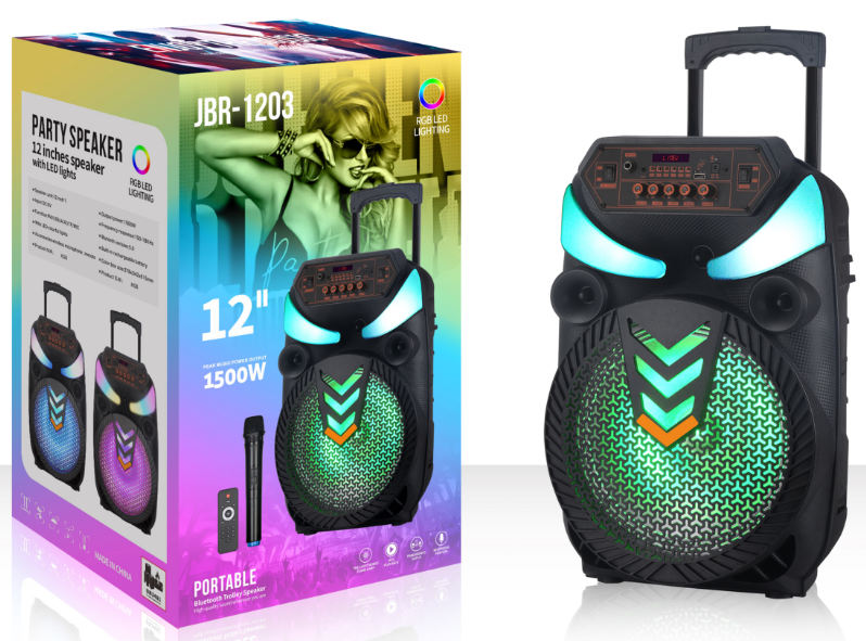 | *Material:Plastic *RMS Power: 20 W *5 knob+LED display *Speaker unit:12inch *Battery:7.4V/2400MAh *Function:USB/TF/Bluetooth/FM/TWS/ *Accessory:Adapter,manual,remote control,wireless microphone*1 |