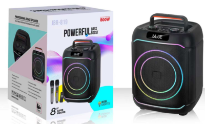 | *Material:Plastic *RMS Power: 40 W *1knob+LED display *Speaker unit: 1×8 inch *Battery:7.4V3600mAh *Function:USB/TF/Bluetooth/FM/TWS/ *Accessory:Adapter,manual,remote control,wireless microphone*2 (2.4G) |