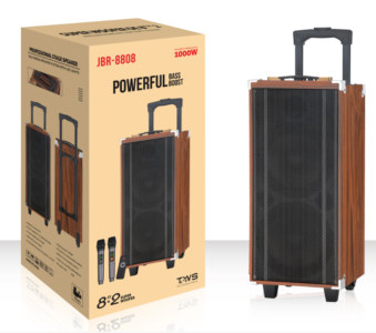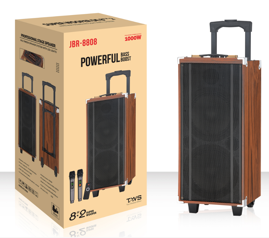 | *Material:Plastic *RMS Power: 50 W *2 knob+LED display *Speaker unit: 2X8 inch *Battery:7.4V/3600mah *Function:USB/TF/Bluetooth/FM/TWS/ *Accessory:adapter,manual,remote control,wireless microphone*1 |