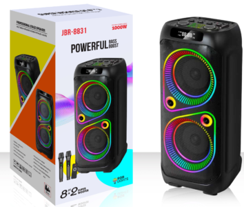 | *Material:Plastic *RMS Power: 50 W *5 knob+LED display *Speaker unit:2X8 inch *Battery:7.4V/5400MAh *Function:USB/TF/Bluetooth/FM/TWS/ *Accessory: Adapter,manual,remote control,wireless microphone*2 |