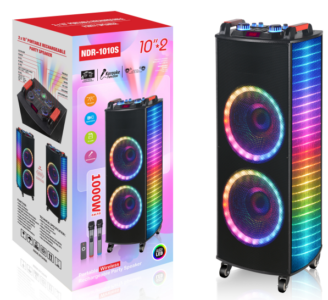 | *Material:Wooden Box *RMS Power: 60 W *7 knob+LED display *Speaker unit:2X10 inch *Battery:12V/7Ah (Lead Acid battery) *Function:USB/TF/Bluetooth/FM/TWS/ *Accessory:AC Charging cable,manual,remote control,wireless microphone*2 (VHF) |