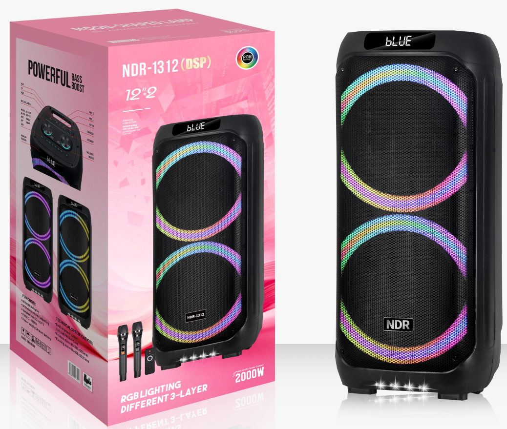 | *Material:Plastic *RMS Power: 60 W (DSP) *6 knob+LED display *Speaker unit:2X12 inch *Battery:11.1V4500mah *Function:USB/TF/Bluetooth/FM/TWS/ *Accessory:AC cable,manual,remote control,wireless microphone*2 UHF |