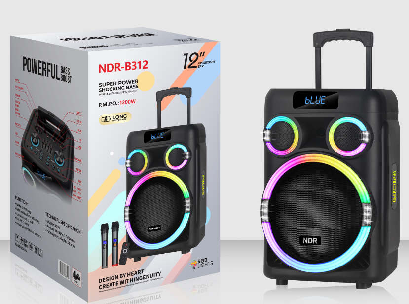 | *Material:Plastic *RMS Power: 50 W *2 knob+LED display *Speaker unit:12inch *Battery:7.4V/5400MAh *Function:USB/TF/Bluetooth/FM/TWS/ *Accessory:Adapter,manual,remote control,wireless microphone*2 |