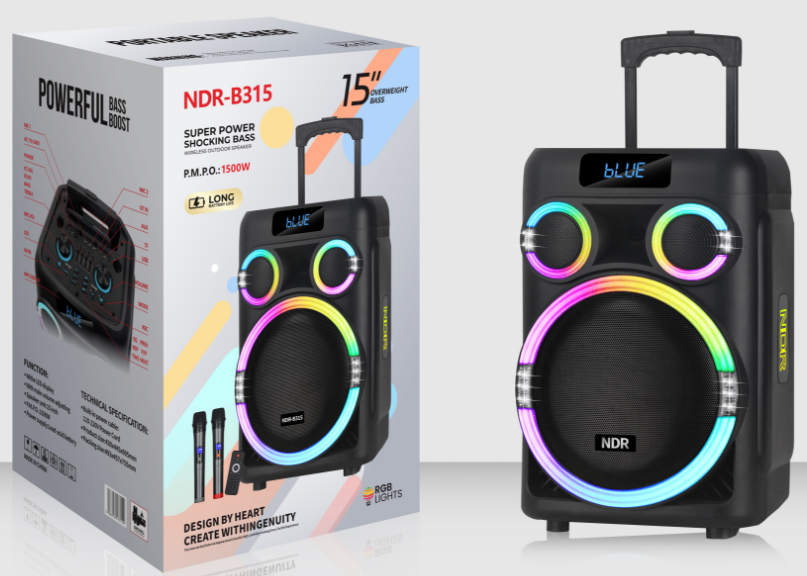 | *Material:Plastic *RMS Power: 60 W *2 knob+LED display *Speaker unit:15inch *Battery:12V/7A *Function:USB/TF/Bluetooth/FM/TWS/ *Accessory:Adapter,manual,remote control,wireless microphone*2 |