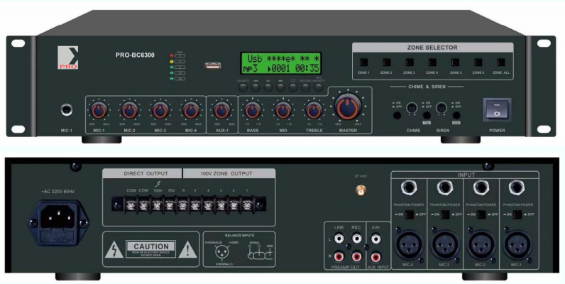 | Pubblic Address Amplifier Output Power:300W 6 Mono channels output USB/BT/FM/AUX, 4-way 6.35MIC input, 4-way XLR MIC input, Doorbell function, Alarm function Product size: L480*D375*H90mm Packing size: L502*D414*H161mm |